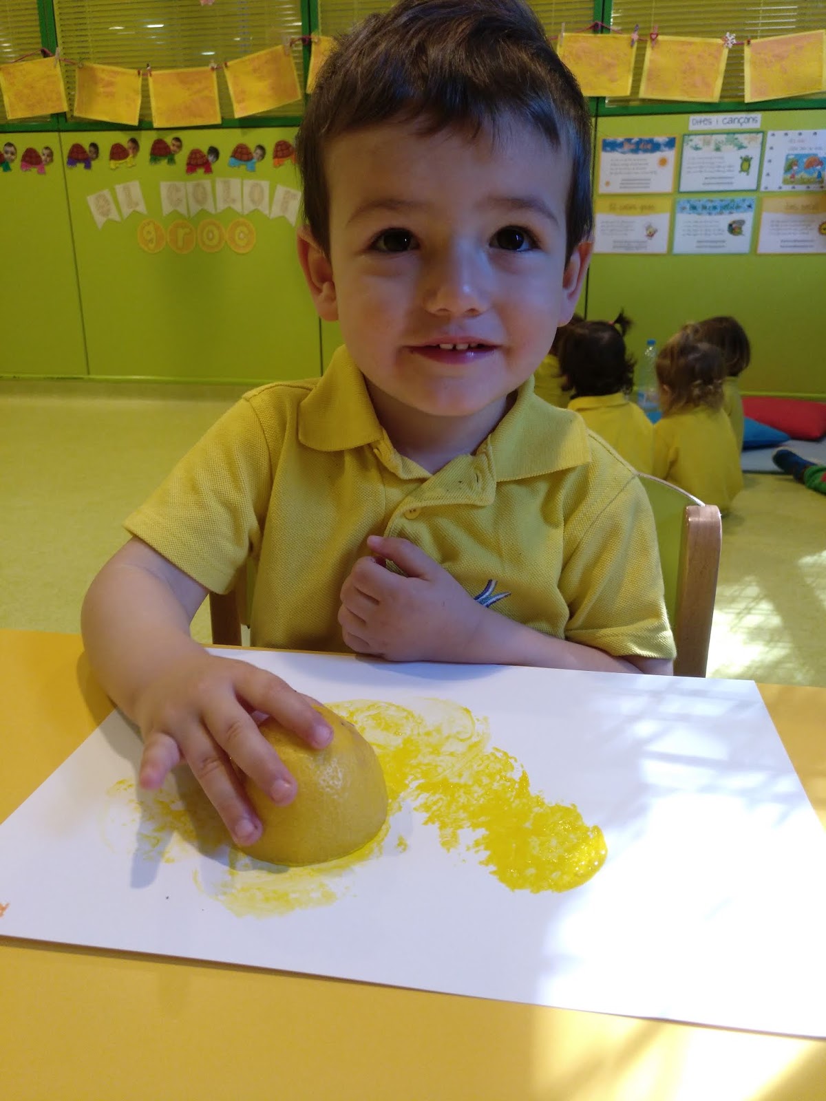 utilitzant les manetes, els ditets i pintura groga tot creant dibuixos molt bonics!