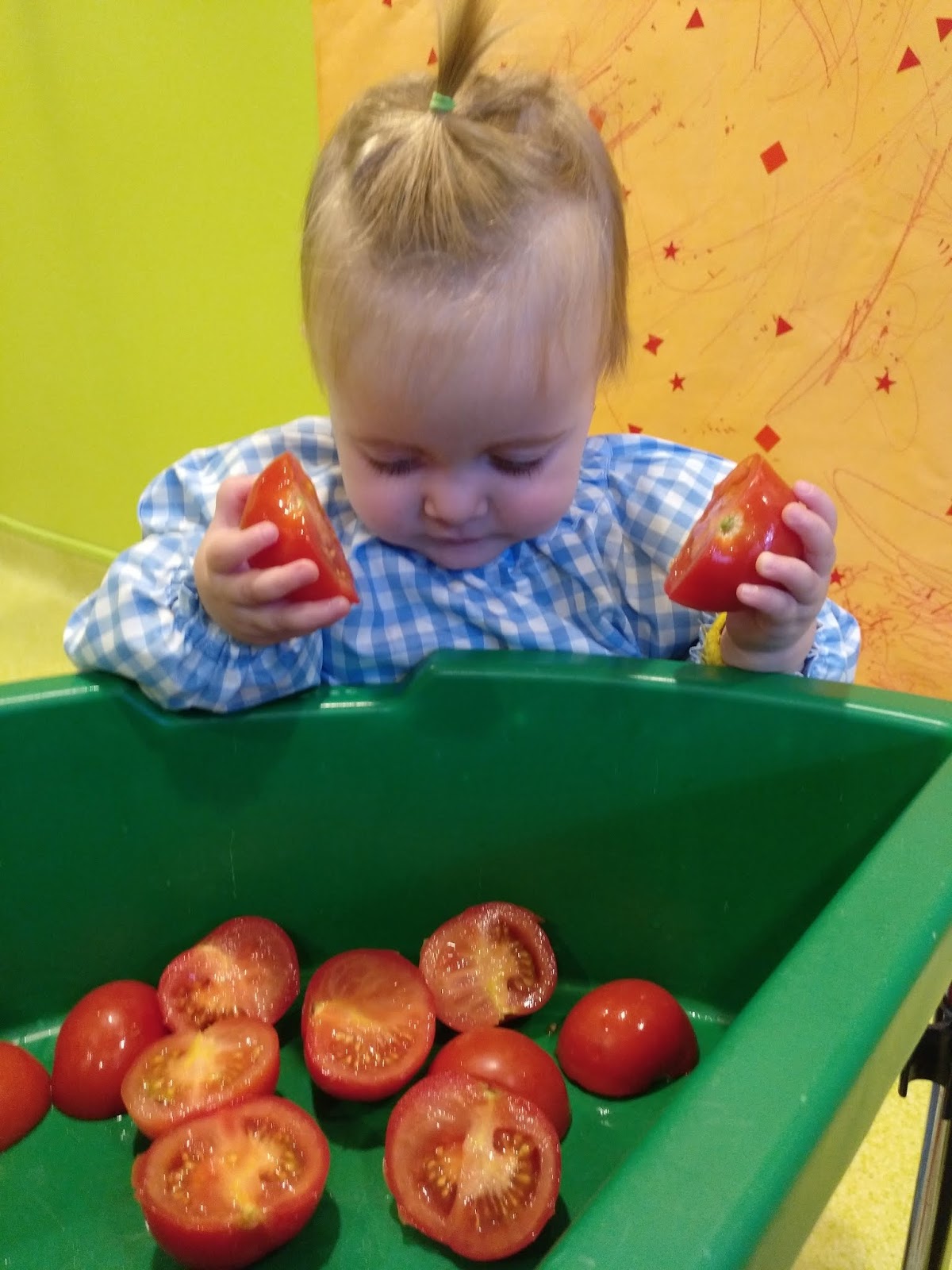 A més, com a activitat de descoberta sensorial, hem pogut experimentar amb tomàquets!! Els hem tocat, apretat, fet rodar i, alguns de nosaltres, hem fet suc de tomàquet!